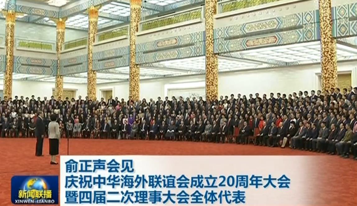 中共中央政治局常委、全国政协主席俞正声于9月20日在北京人民大会堂会见出席庆祝中华海外联谊会成立20周年大会暨四届二次理事大会的全体代表,与全体代表合影留念并讲话。俞正声代表中共中央向中华海外联谊会成立20周年表示热烈祝贺。 深圳市侨联副主席、正佳国际集团总裁郑凯平应邀出席此次大会。